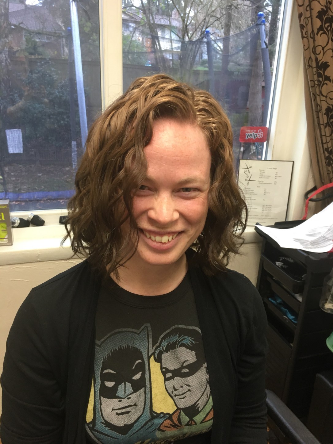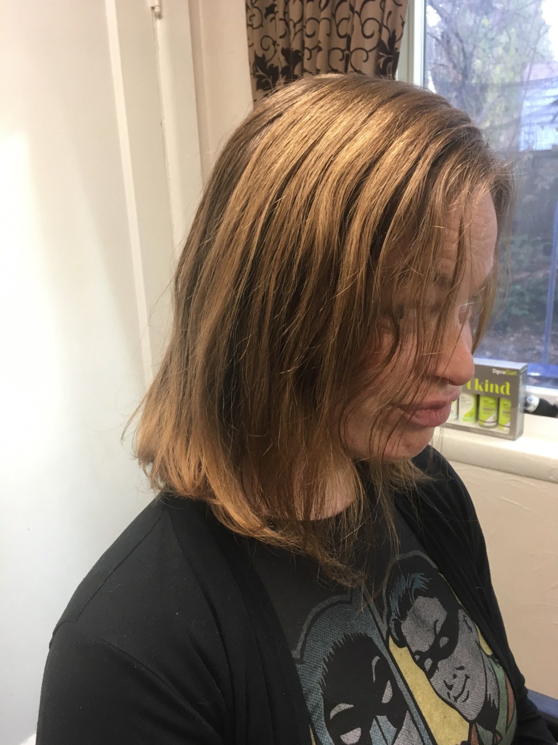 Lily likes a reverse Ombré, with her tips darker transitioning to her natural roots. One of the benefits being she has absolutely no grow out. Those are her natural waves brought out with a No Poo Transformation.