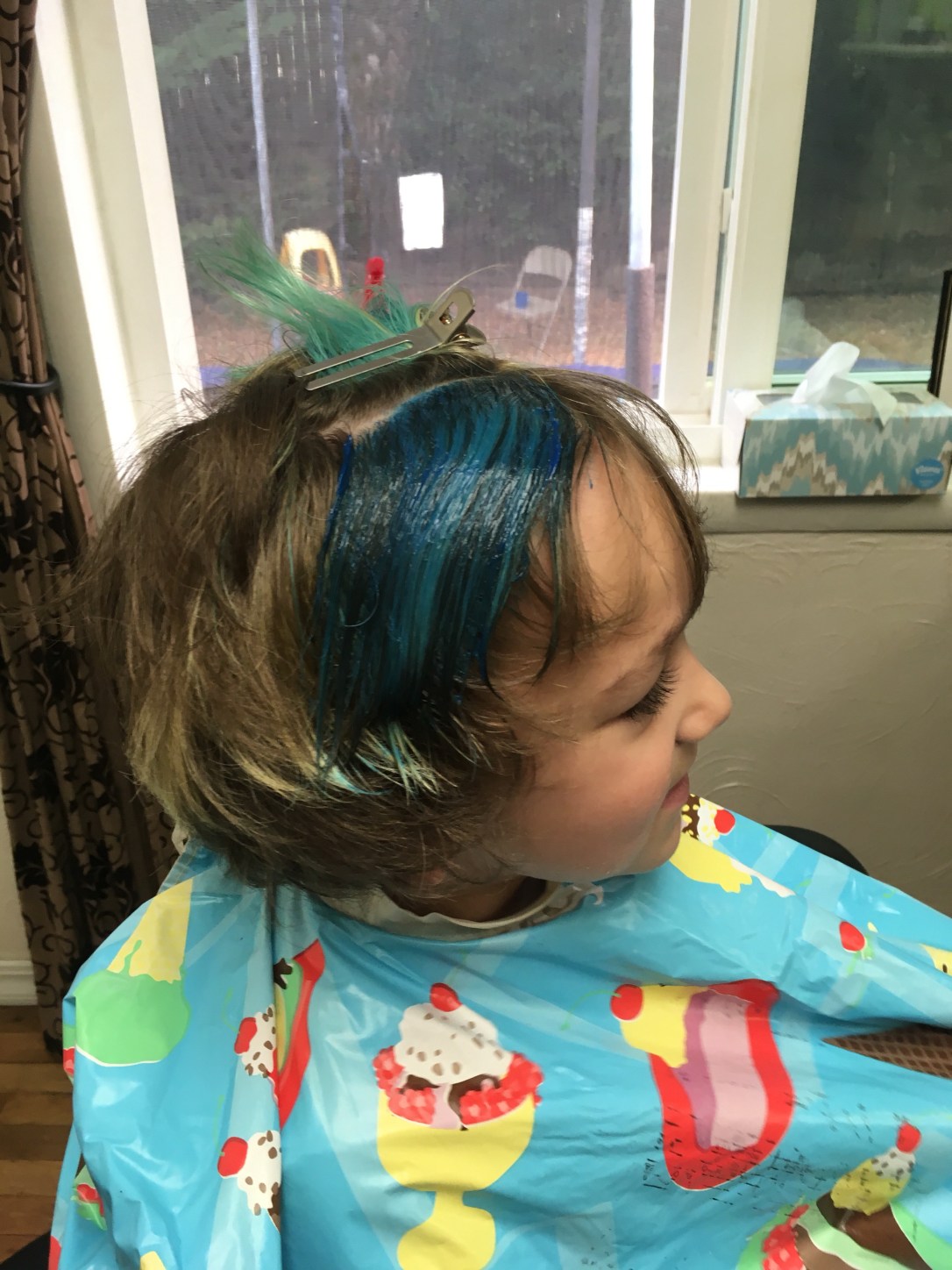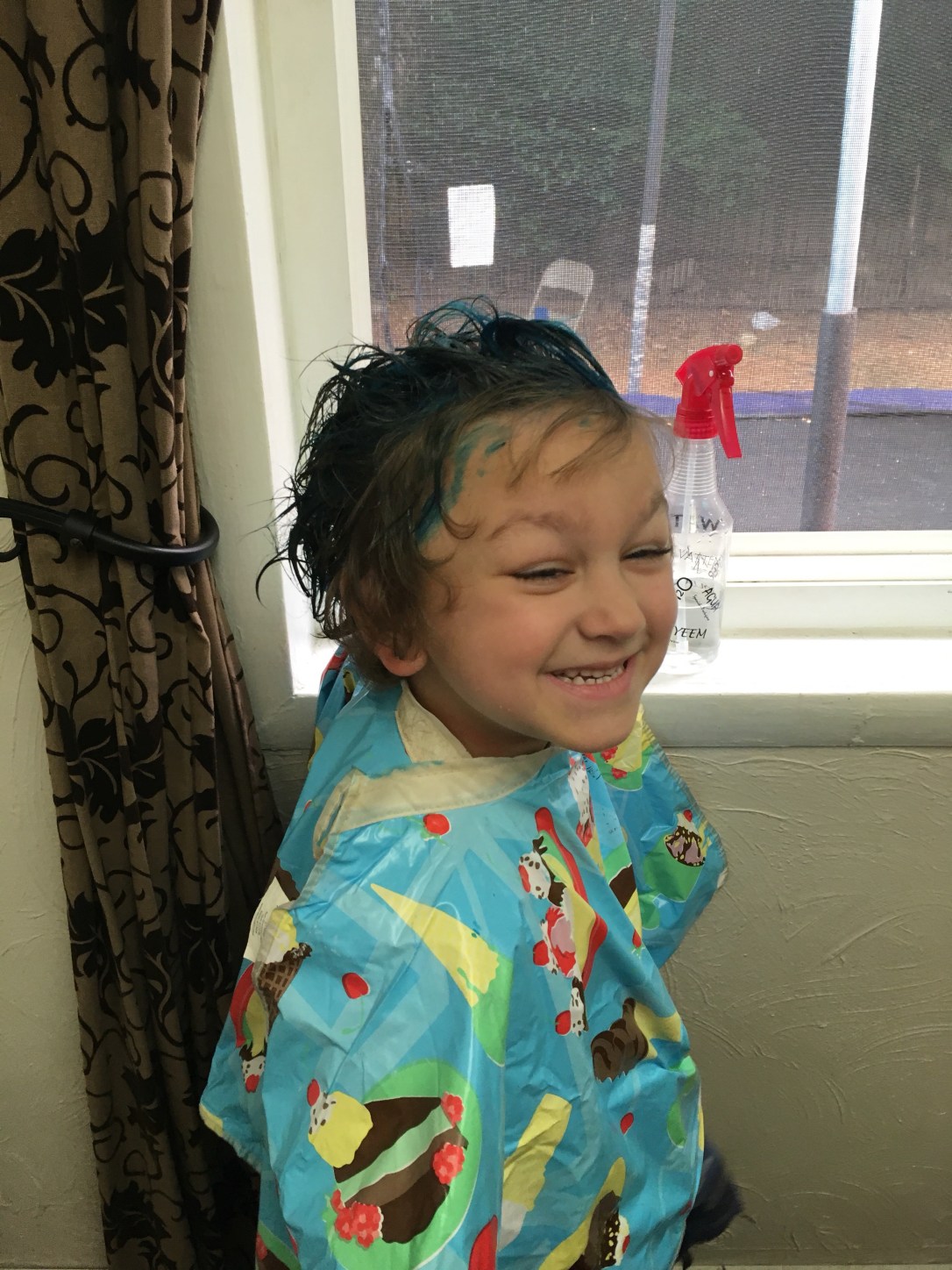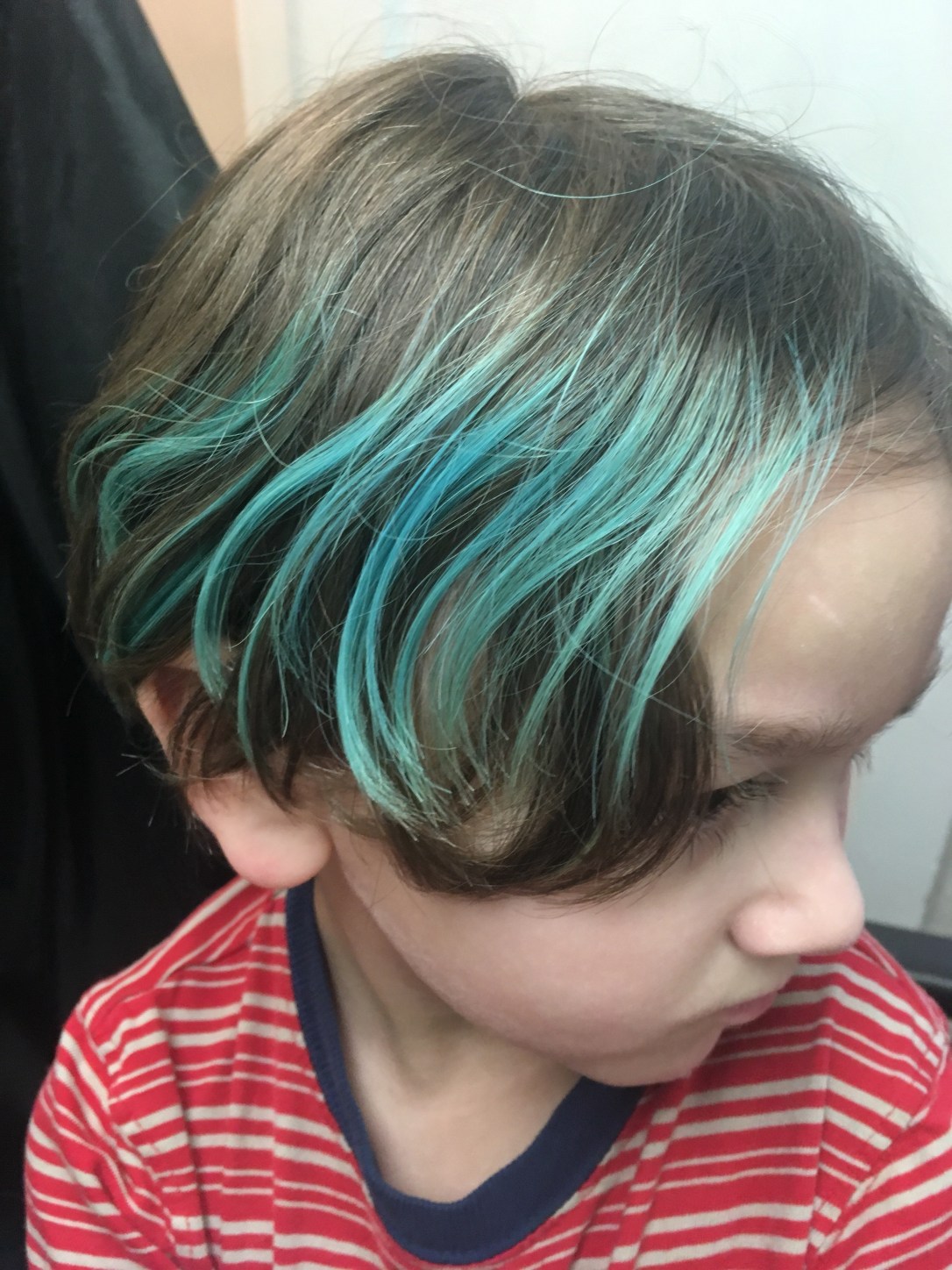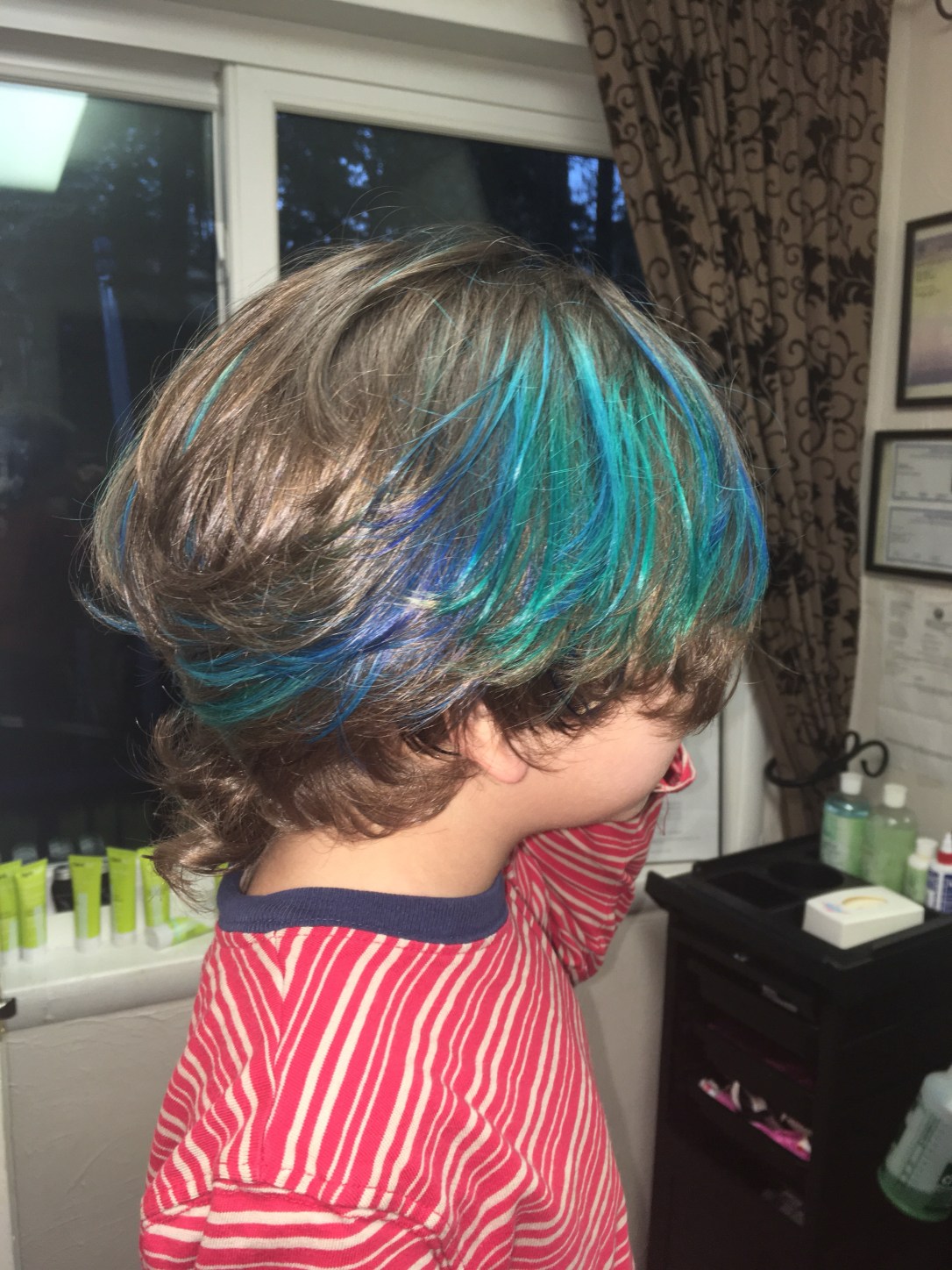 He has gorgeous brown hair.But sometimes you want a little fun. First we had to bleach a spot in preparation for blue.Blue is his favorite color.and as you can see, this is his favorite pose.One spot of blue wasn’t nearly enough and his original color was fading.So we added some more and refreshed his fading blue.He is excited!In all his pictures at preschool, he draws himself with blue hair.