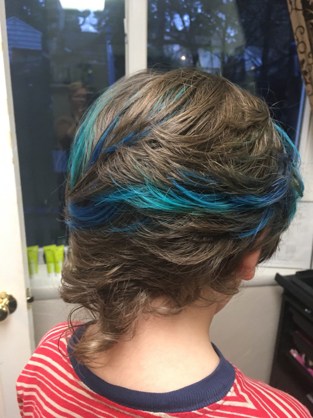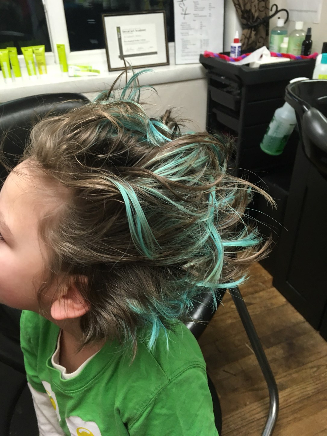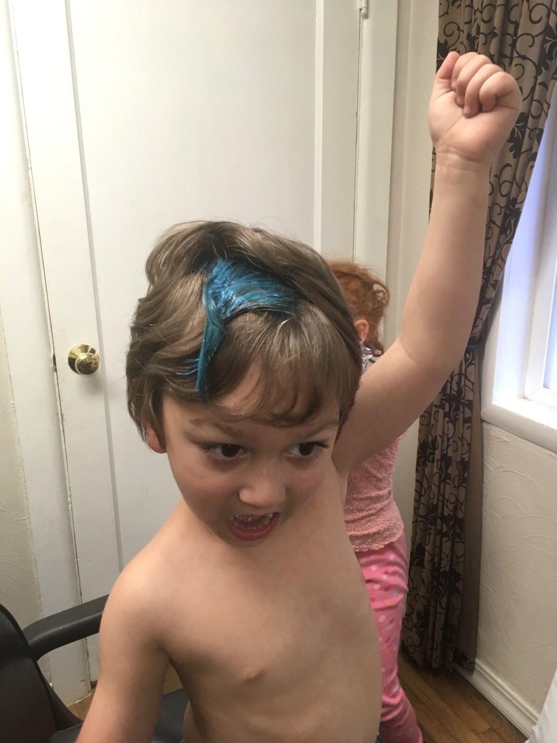 He has gorgeous brown hair.But sometimes you want a little fun. First we had to bleach a spot in preparation for blue.Blue is his favorite color.and as you can see, this is his favorite pose.One spot of blue wasn’t nearly enough and his original color was fading.So we added some more and refreshed his fading blue.He is excited!In all his pictures at preschool, he draws himself with blue hair.