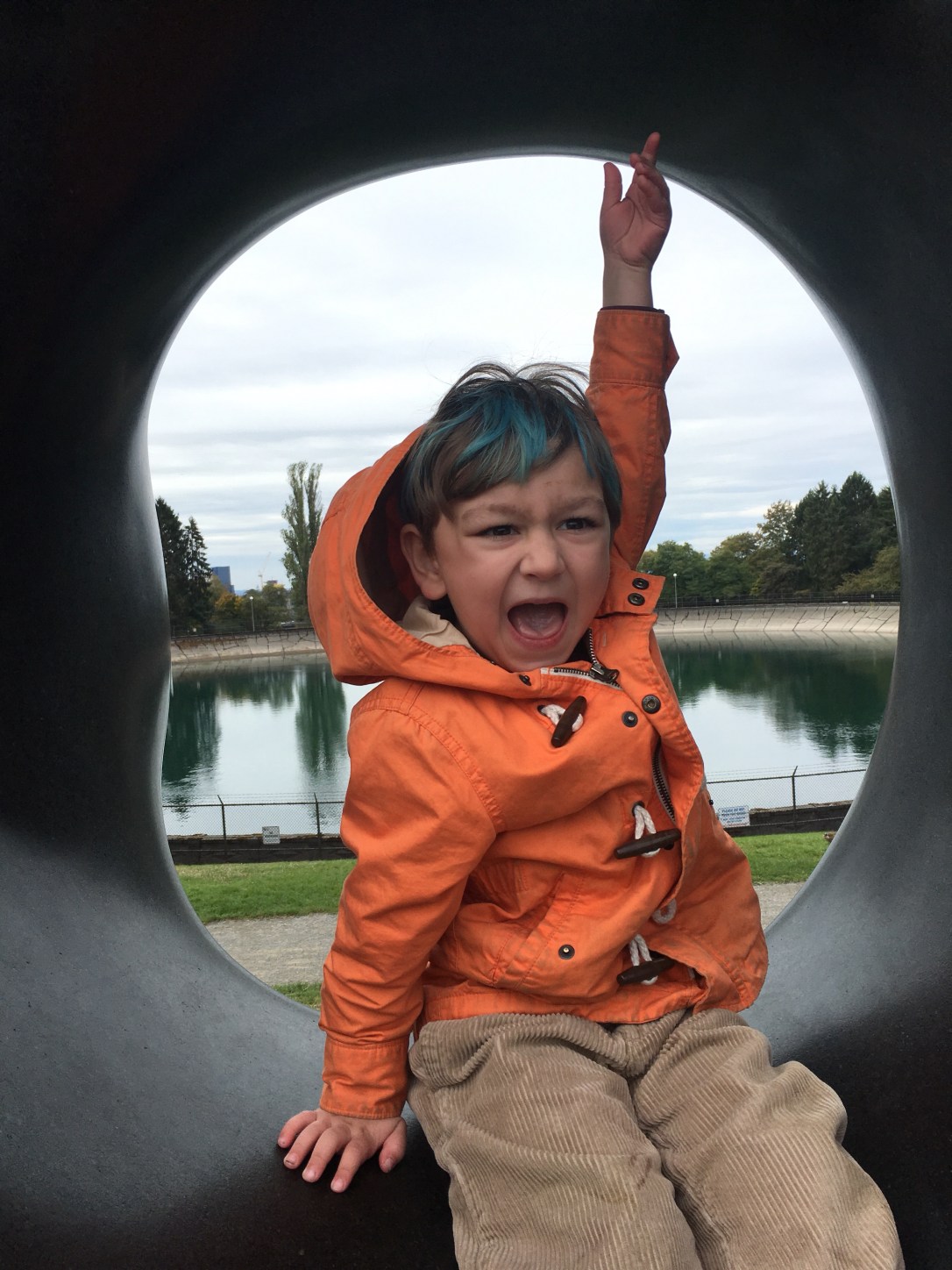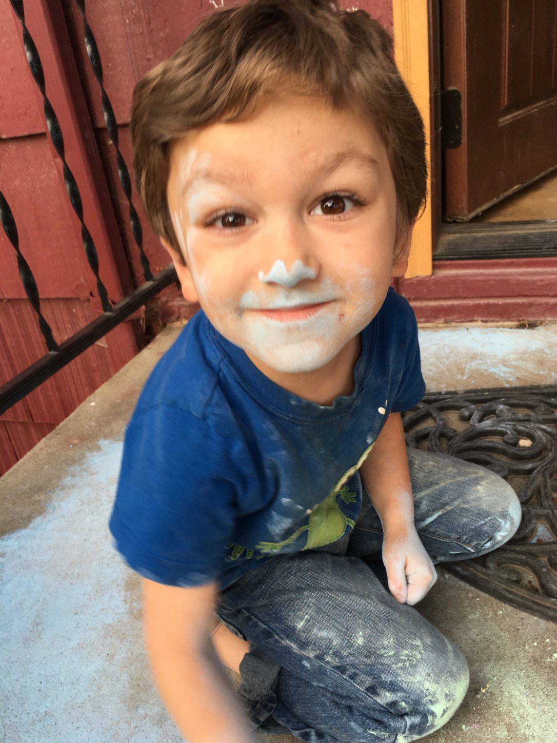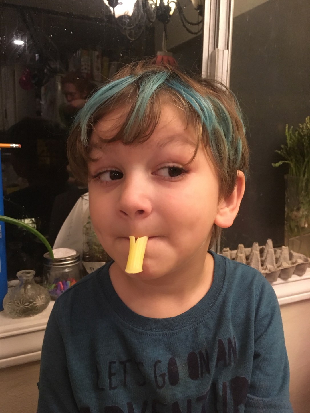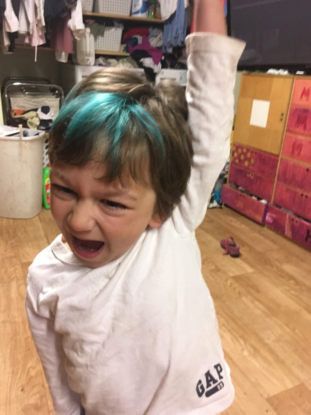 He has gorgeous brown hair.But sometimes you want a little fun. First we had to bleach a spot in preparation for blue.Blue is his favorite color.and as you can see, this is his favorite pose.One spot of blue wasn’t nearly enough and his original color was fading.So we added some more and refreshed his fading blue.He is excited!In all his pictures at preschool, he draws himself with blue hair.
