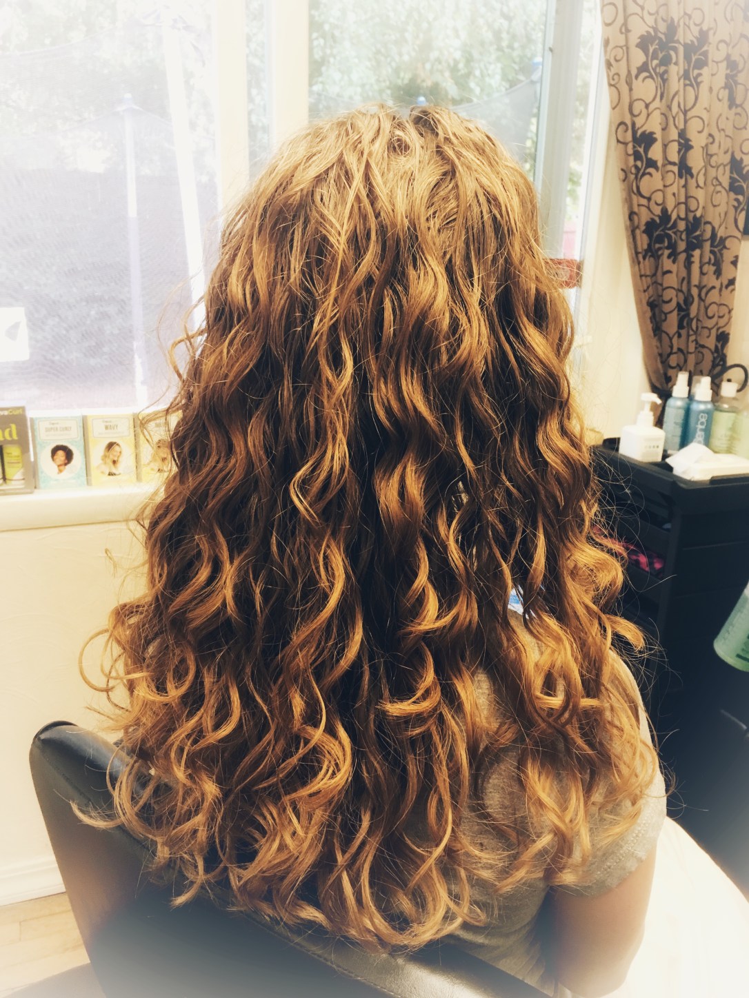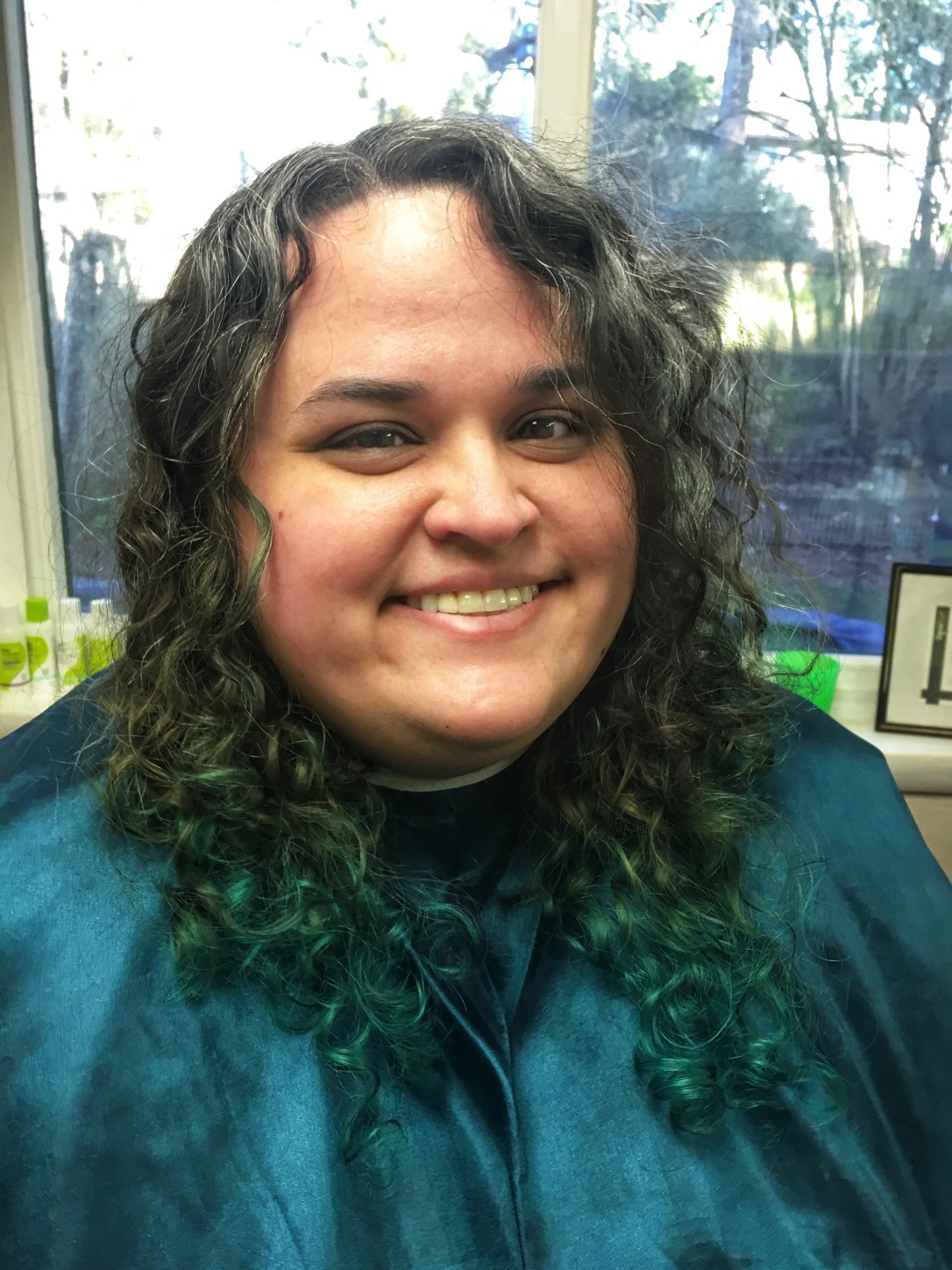 Looking at her hair, I noticed that the underneath layers were much shorter and curlier than the hair that hung over it. If we elevated the interior at all, it would remove the hair that hung over the top, removing her length also. Another challenge was, if we cut the style straight around, she would loose the length in front that she wants.