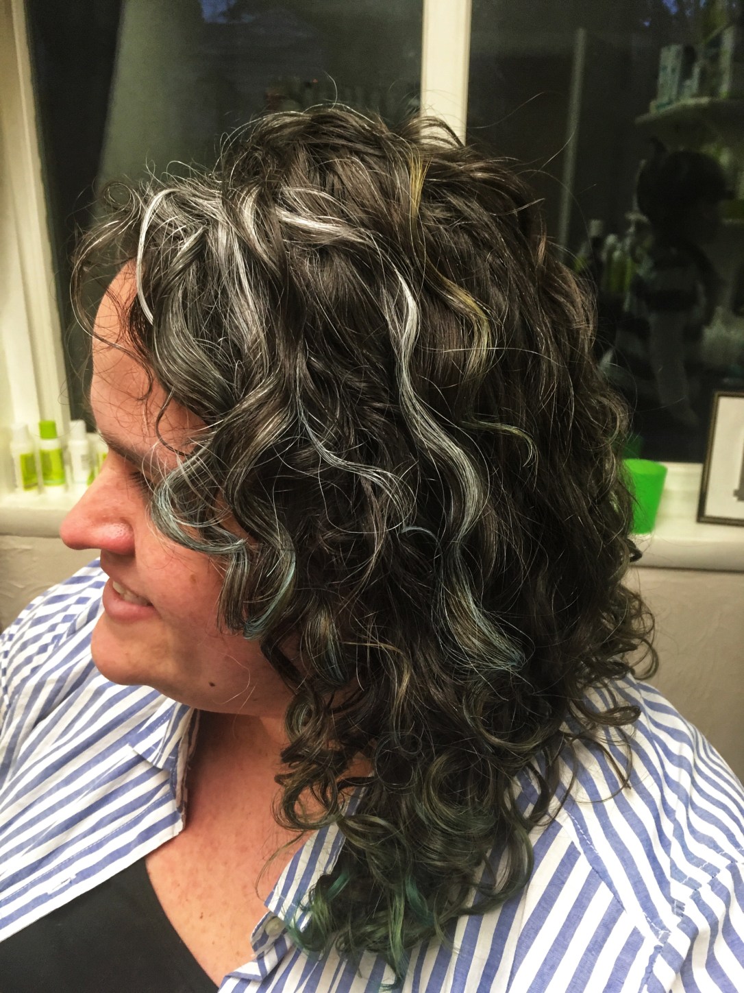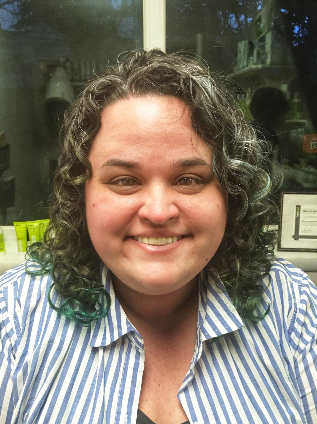 When Errin came to see me, she was ready to loose some length and update her color; her highlights were more blended then she wanted. We started by giving her a DevaCurl signature waterfall cut, bringing up her length and elevating the interior for shape and bounce